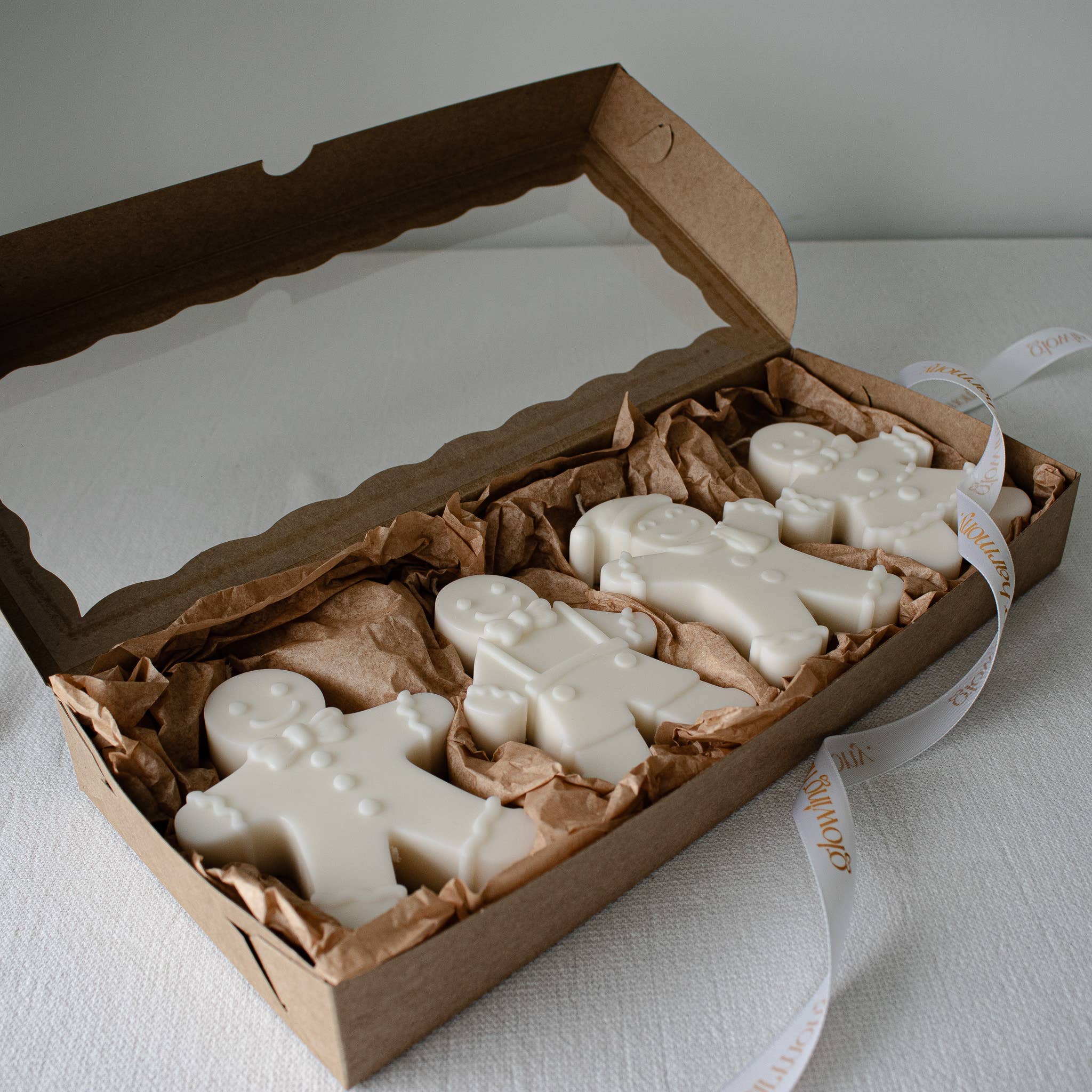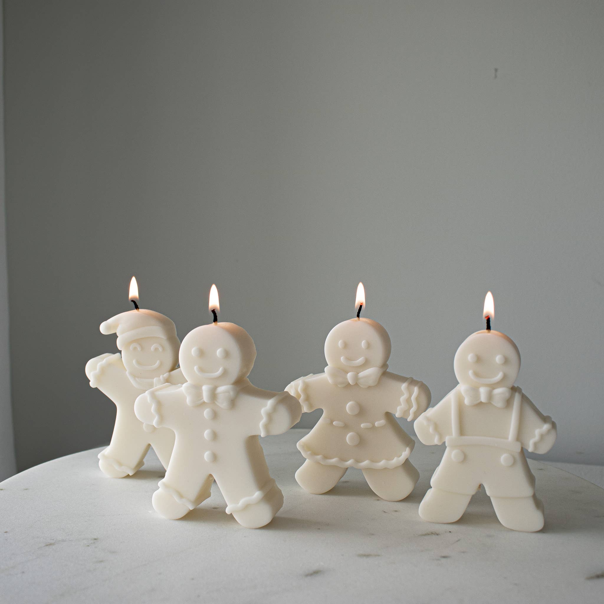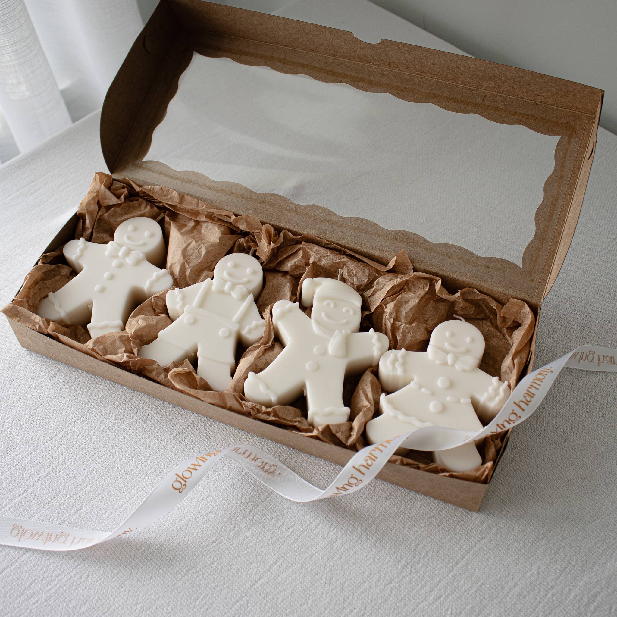 Gingerbread family-shaped candle set. A festive, gift-ready accent perfect for holiday displays and seasonal decor. Set of 4. Hand-poured in small batches using natural soy wax and cotton wicks, each candle reflects our commitment to quality and care. Woman-owned, proudly made in Wake Forest, NC. Crafted with intention-clean ingredients, mindful production, and a whole lot of heart.