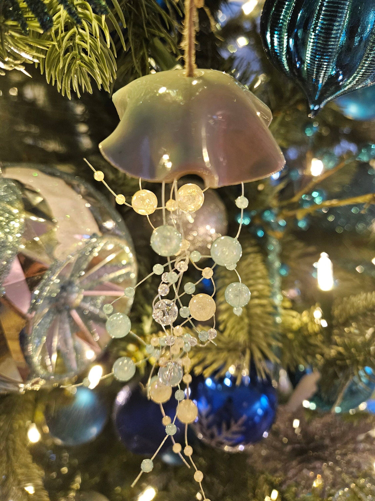 This handmade ceramic jellyfish ornament features fun beaded tentacles and a ceramic form that looks like it's floating in the current -- reminding us to go with the flow. The jellyfish is approximately 3-4 inches long. Light weight and durable. Perfect addition to your tree, hostess gift or garland accessory!