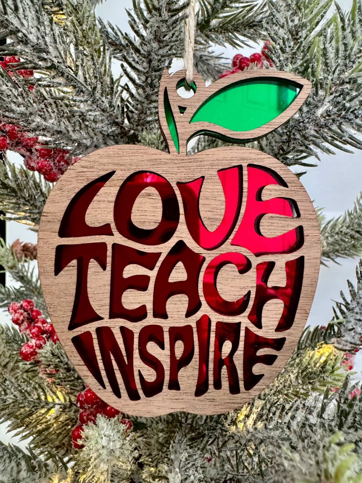 Celebrate the heart of teaching with this layered, laser-cut wooden ornament shaped like a classic apple. Crafted from multiple layers of natural wood, it features beautifully engraved details and the inspiring words “Love, Teach, Inspire.” Its dimensional design adds warmth and charm, making it a perfect gift for teachers, educators, or anyone who makes a difference in the lives of others. Hang it on the tree or display it year-round as a reminder of the passion and dedication that shape brighter futures.
