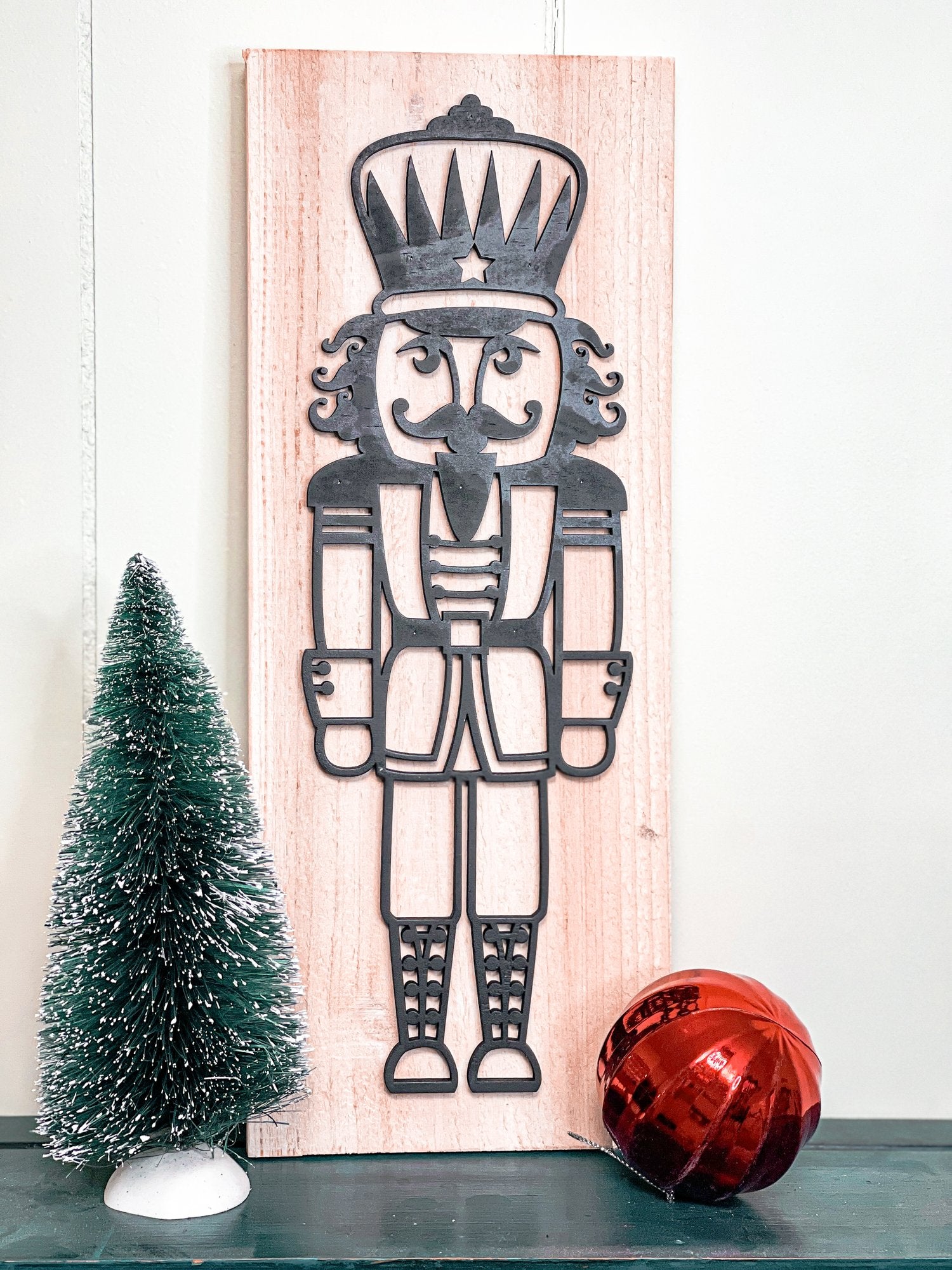 We have taken cedar wood and whitewashed it with an ivory paint. We then hand distress it before applying our wooden nutcracker cutout. This festive addition will look great leaned up on any shelf or mantle. It can also be placed on an easel for easy display.