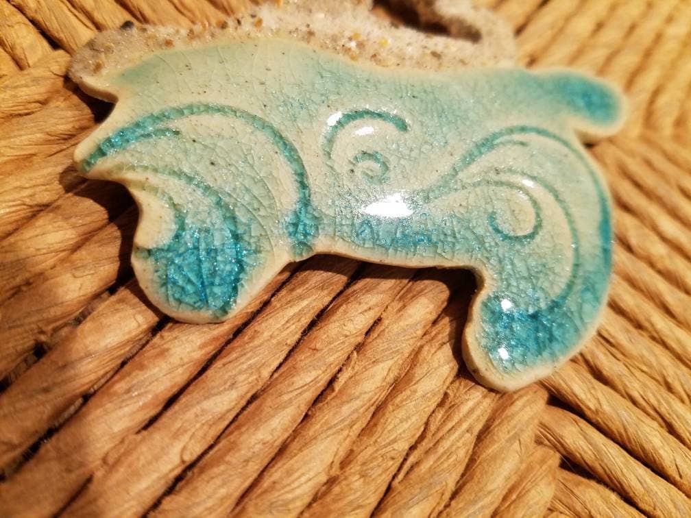 Sea turtle lover ceramic ornament. Each turtle is handmade with NC clay, and stamped with an ornamental shell. A signature sand coating is applied and sealed onto the ornament. A vibrant teal crackle glaze finishes off this beautiful ornament. Light weight and durable, these make wonderful additions to any tree!