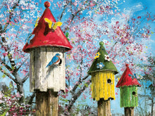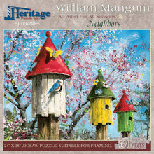 hese birdhouse neighbors are enjoying a beautiful sunshiny day. Artist William Mangum has done it again in this very colorful, detailed painting. Bird lovers and puzzle lovers are sure to enjoy this gorgeous puzzle. Suitable for framing.