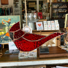 These stained glass cardinals are made using the copperfoil method invented by Louis Comfort Tiffany. Each piece of glass is individually cut and foiled and soldered together with beaded accents. Each one is made by hand, making each one slightly unique and different.