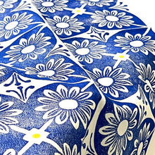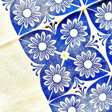 This bright tea towel printed in indigo with dots of cheery yellow -- Fun for your kitchen or picnic basket.