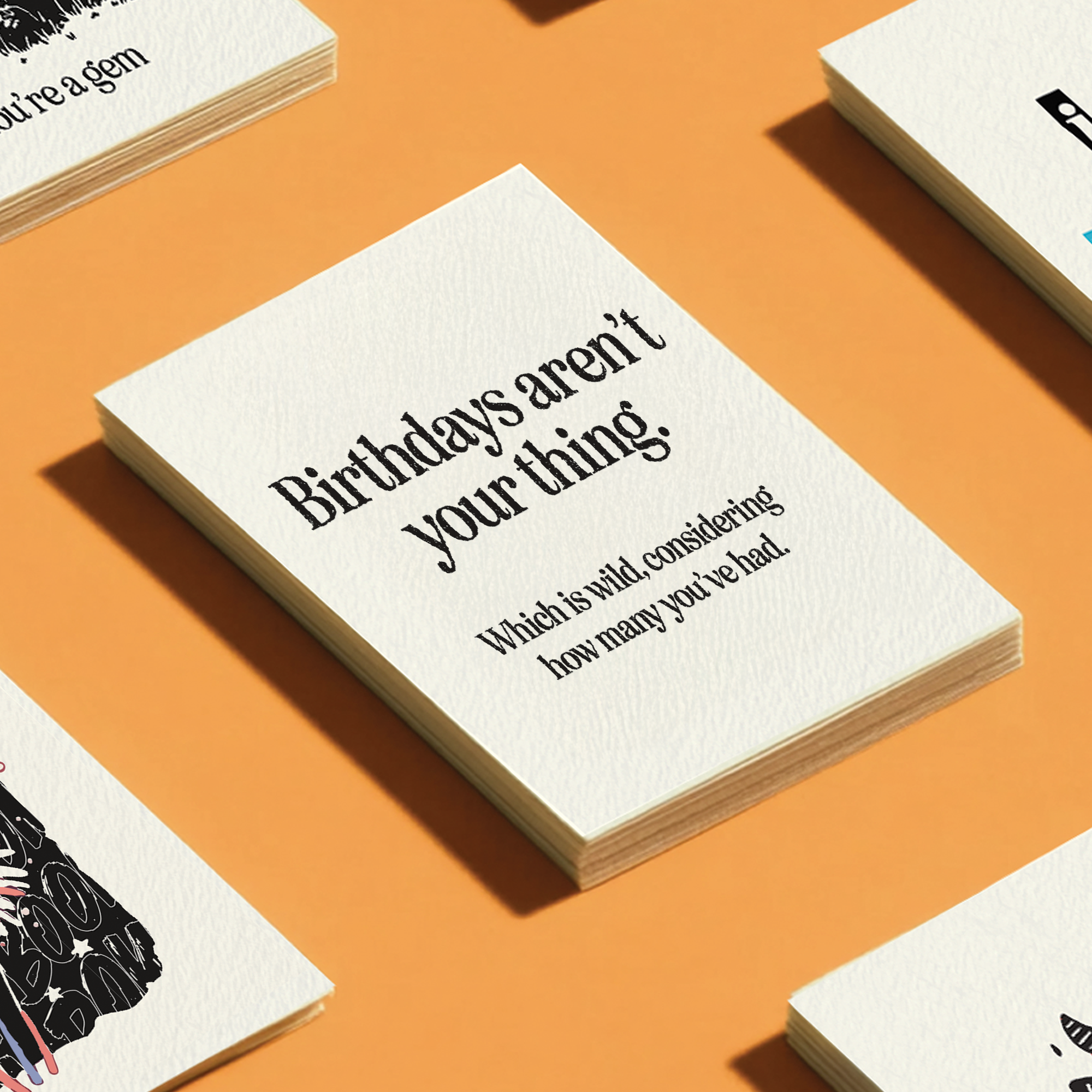 - Front Text: "Birthdays aren’t your thing. Which is wild, considering how many you’ve had."
