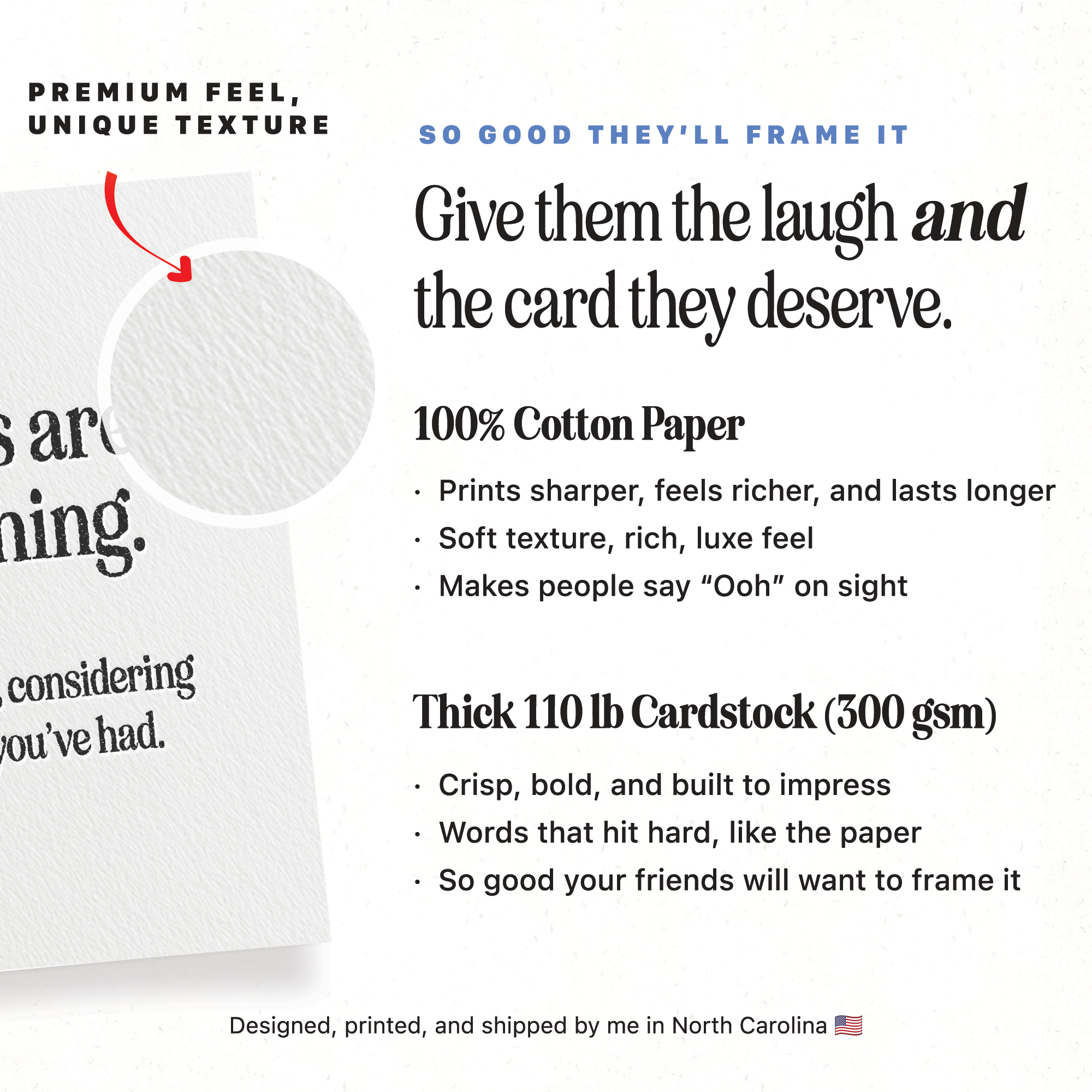 his card is the perfect mix of dry wit and playful roast, for that friend who insists they “don’t celebrate birthdays” but still expects you to show up with a card. And cake. Obviously.